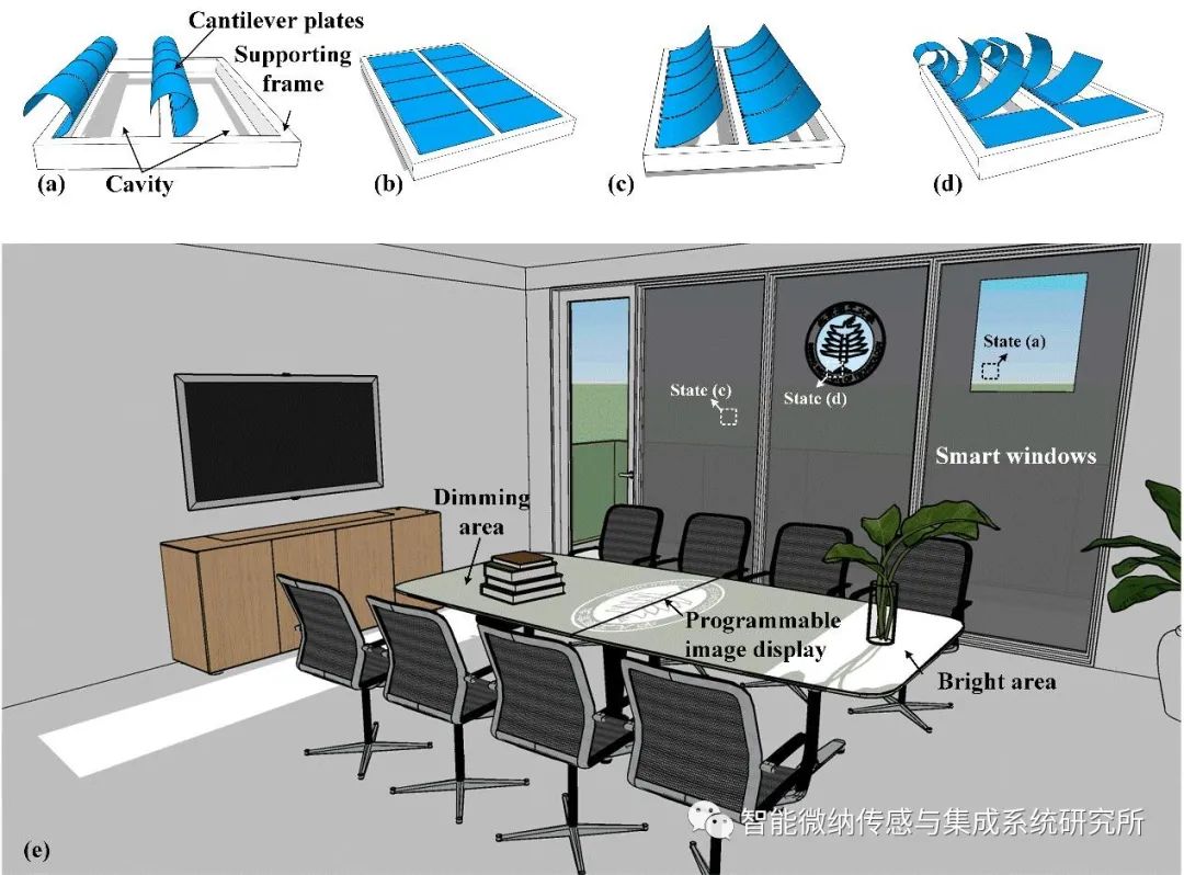 (a)电热式Microshutter的开态;(b)关态;(c)半开态;(d)多态混合;(e)可连续控光Mircoshutter的应用场景:智能窗户。