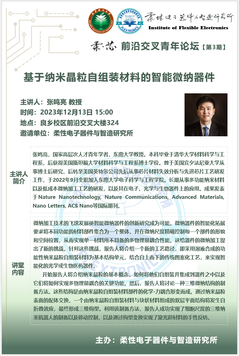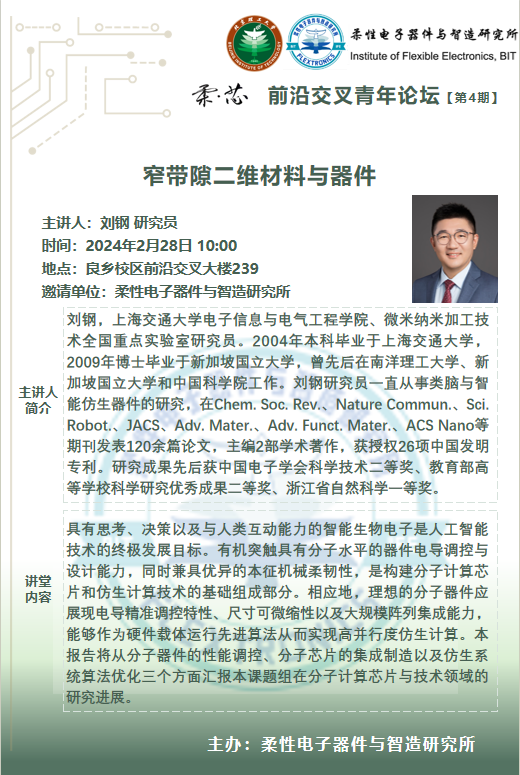 柔性电子器件与智造研究所 (Institute of Flexible Electronics, BIT)由国家杰出青年基金获得者沈国震教授组建,依托北京理工大学白小姐论坛 ,聚焦后摩尔时代微电子器件与集成电路的革命性发展方向,面向国家重大需求和国际前沿,基于柔性电子可拉伸、弯曲、折叠的形态特点,可转移、印刷的加工工艺,曲面共型、动态跟随的新应用拓展,从本征柔性低维半导体合成、工艺开发、设备研制、系统研制等方面开展系统的前沿基础与应用研究,主要方向包括:柔性光电器件与视觉芯片,柔性感知与智能机器人,仿生传感器与健康医疗,柔性多功能集成系统的设计与应用。研究所致力于打造一流的柔性电子专精特色研究平台,多学科交叉融合的公共实验平台,新型电子器件与系统集成高水平研究中心,集成电路与电子学科人才高地,未来颠覆性高精尖国防应用装备技术的研究中心,在引领该领域的学术技术前沿同时,着力培养具有精湛专业能力、思辨精神和家国情怀的新一代人才。
