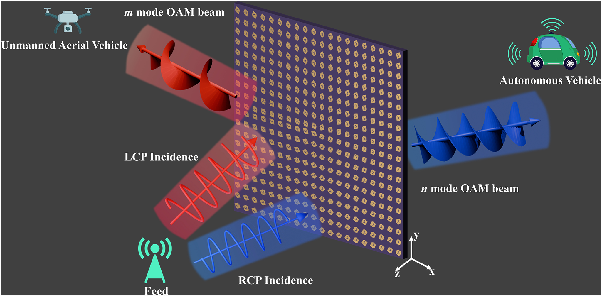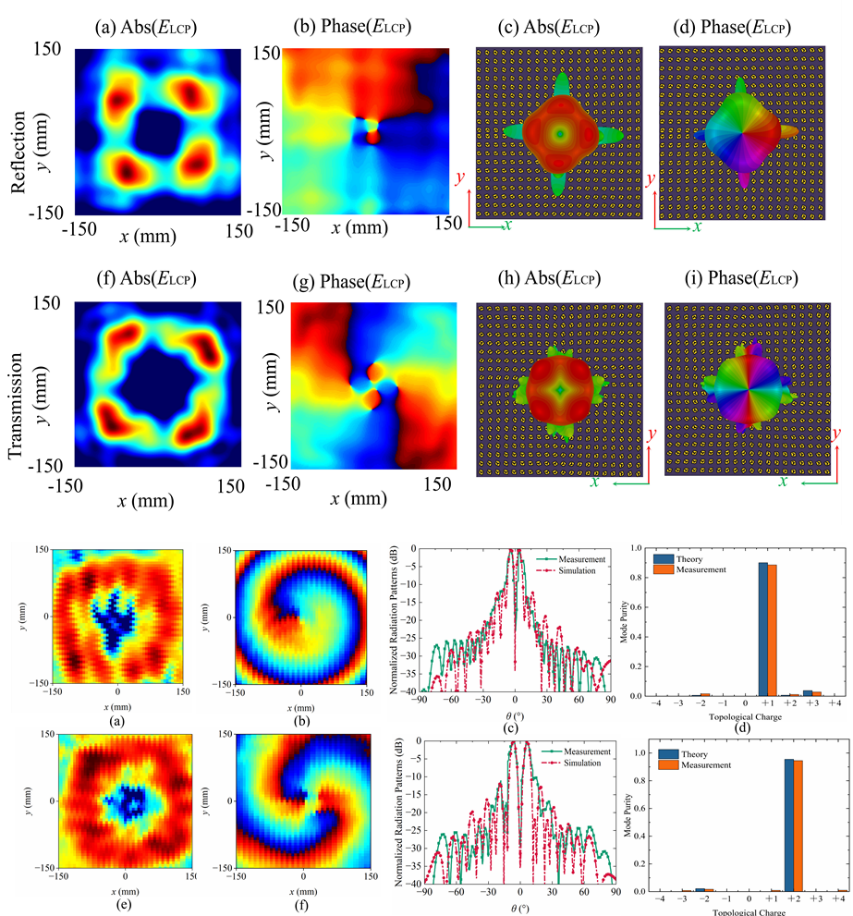 极化选择超表面作为实现多功能、高精度电磁波调控的核心技术之一,近年来在智能通信、信息处理与新型雷达系统等前沿领域受到广泛关注。然而,当前技术方案普遍面临能量利用效率不高、通道间极化串扰严重等关键瓶颈,极大限制了其实用化和系统集成能力。为解决这一难题,司黎明教授课题组成功设计并实现了一种工作于X波段的新型高效率全空间极化选择超表面。该超表面通过引入几何相位与传播相位协同调控机制,突破传统多层堆叠与结构复杂限制,显著提升了系统整体性能。实验证明,该超表面不仅能够在反射与透射模式下分别实现不同的轨道角动量调控(OAM)——反射模式下模态 𝑙=+1 的纯度高达 90.08%,透射模式下模态 𝑙=+2 的纯度则达到 95.51%,还实现了近100%的超高效率全空间调控能力,实测效率高达97%。该超表面架构高度集成、结构紧凑,可实现双通道涡旋波的高效复用与解复用,展现出全空间、无串扰、高效率的电磁波波前控制能力。有望在高容量通信系统中展现显著优势,并在无人机、自动驾驶及电磁空间信息传输等前沿领域拥有广阔的应用前景。