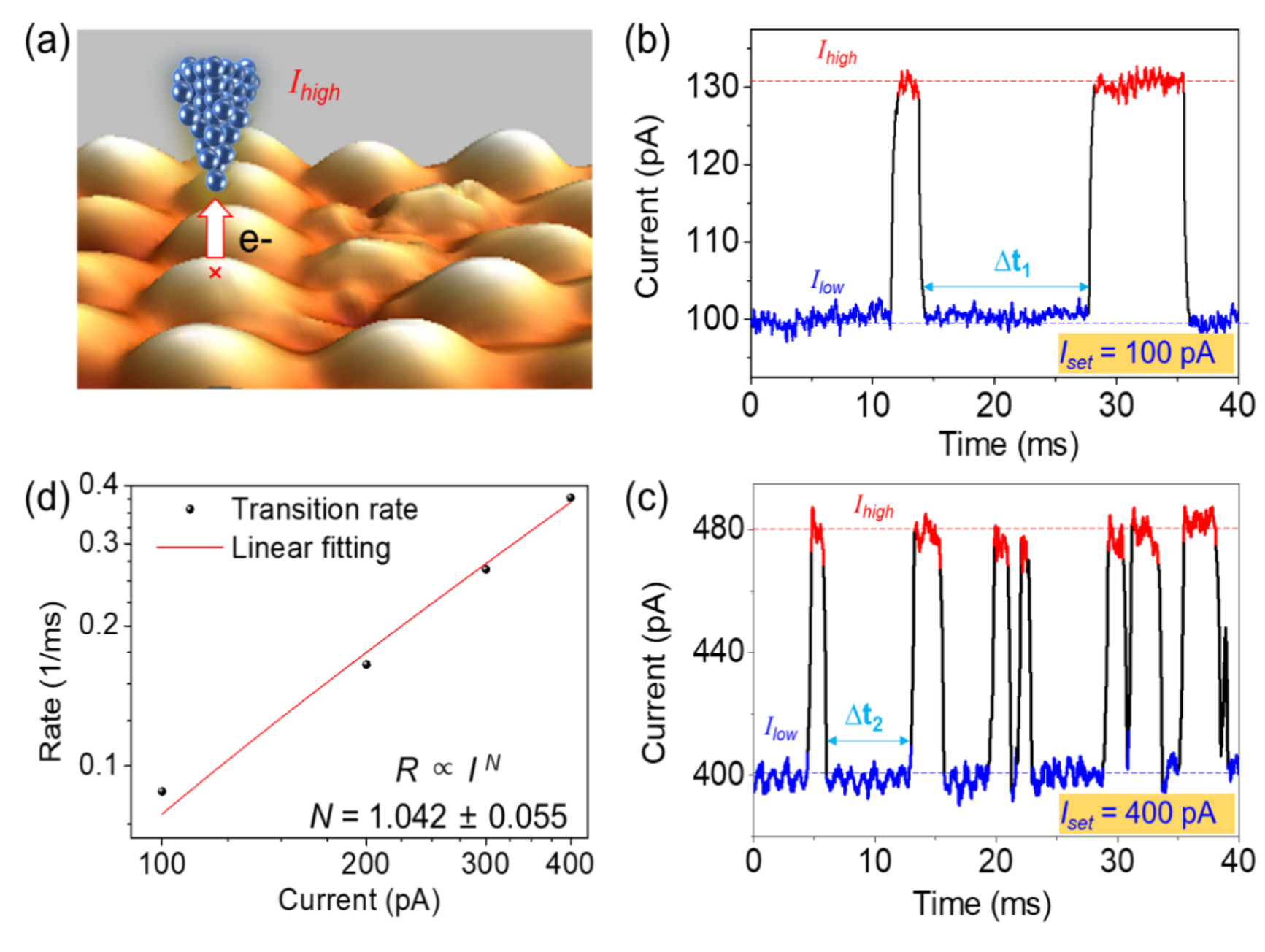 图1. 利用单电子隧穿实现了CDW阵列双稳态可逆转变。(a)CDW阵列在电流驱动下转变的示意图。(b, c)电流-时间谱线显示转变瞬间的高低电流变化,大的电流驱动使得双稳态转变更快。(d)电流-时间谱线统计拟合,满足隧穿电流与转变几率的线性关系,证明了单电子隧穿过程。