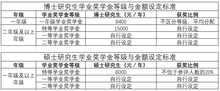 1.博士研究生奖励标准:学校根据核定人数,按每年人均不低于8400元下发各单位分配额度,各年级奖励等级与标准由白小姐论坛 制定。原则上分三个等级,并设定金额级差。其中,一年级博士研究生学业奖学金不分等级,三年级及以上博士研究生须设立特等奖学金,奖励金额不低于每生每年15000元,奖励比例不低于参评人数的10%。