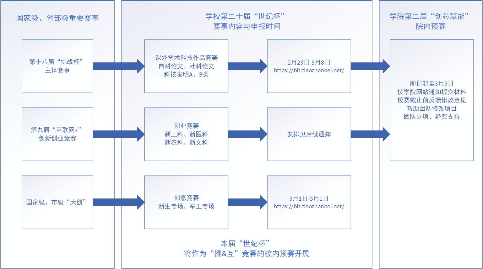 3月1日-5月1日,参赛学生登陆北京理工大学挑战杯网站(//bit.tiaozhanbei.net/)申报。赛事通道预计3月1日00:00正式上线,4月30日23:59关闭申报通道后,申报人将无法进行任何操作。