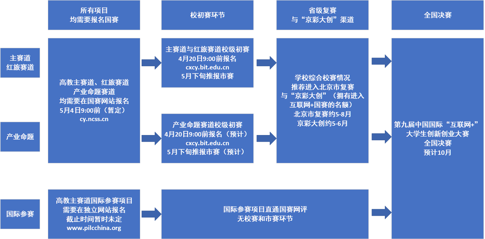 为进一步浓厚学校创新氛围,引导学生努力培养创新精神和创业能力,选拔优秀团队参加第九届中国国际“互联网+”大学生创新创业大赛、第二届“京彩大创”北京大学生创新创业大赛,学校现组织开展第九届“互联网+”大赛的参赛工作,并举办第九届中国国际“互联网+”大学生创新创业大赛北京理工大学校级初赛(简称“互联网+”校赛)暨北京理工大学第二十届“世纪杯”大学生创业竞赛。现将有关事项通知如下。